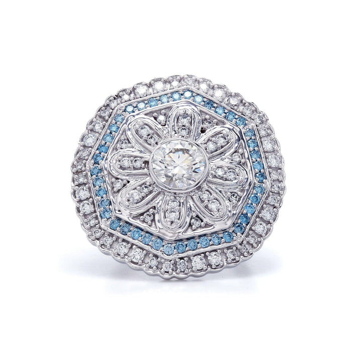 A truly exceptional look, this gorgeous ring adds a vibrant pop of color to your attire with this beautiful blue and white lab grown diamond ring. Crafted in 14K white gold, this vivid design is centered by a flower-shaped halo of 1.60 carat total weight of bright blue and white lab grown diamond wrapped in a frame focuses on the center white I-J, VS-SI lab grown 1.15 carat diamond.