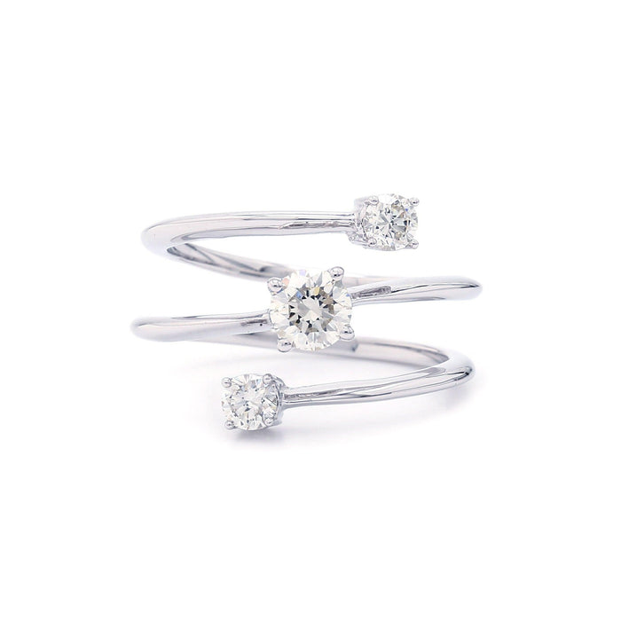 Modern and alluring, this lab grown diamond ring is a memory in the making. A dazzling three stone look that features a sparkling I-J color and VS-SI clarity lab grown diamonds totaling 3/4 carat. The sculpted swirl shank artfully bypass's the center stone and ends each with a diamond tip for a mesmerizing design in 14k gold.