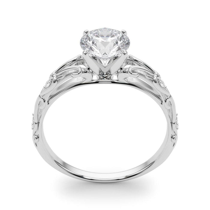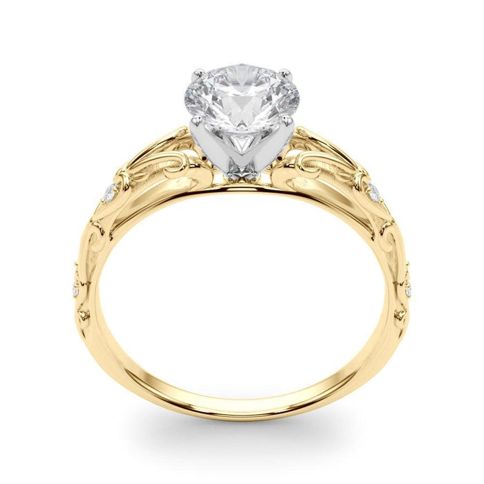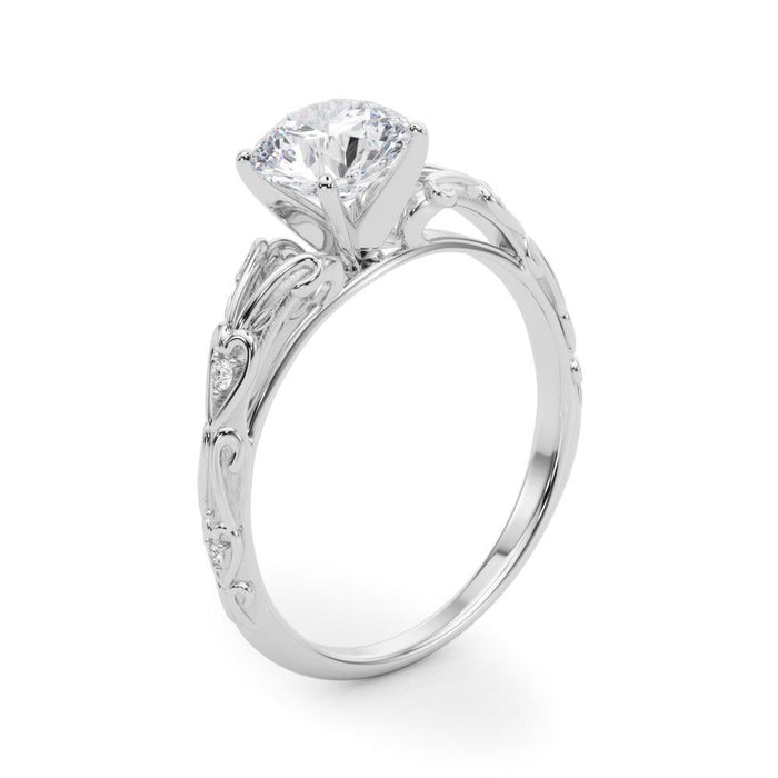 This stunning Vintage Arlene 1/2 carat lab grown round diamond in K VS color/clarity features 1/20Ct. T.W lab-grown diamond accents centered into the heart work on the side for extra brilliance and sparkle. Crafted to last, this engagement ring is the perfect way to add a vintage flare to this special occasion. This warm K color center diamond comes in faint yellow and light brown earth tones. It's off-white tone gives it that vintage look.