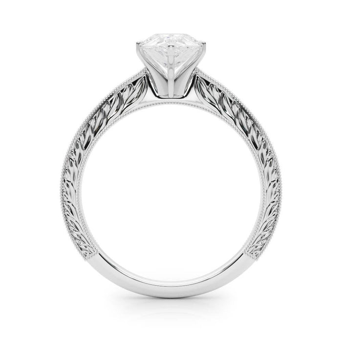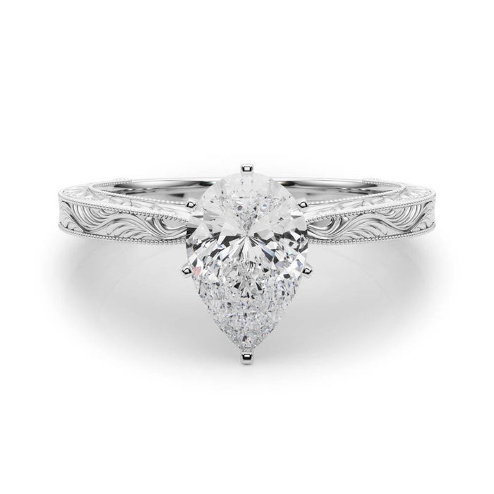 The Addison Solitaire Setting is a timeless engagement ring crafted with vintage etch work and mil-grain for a classic and elegant look. Its intricate design guarantees a unique and memorable ring that symbolizes your lasting love. Choose between the bright white G VS lab grown diamond or the vintage center pear shaped diamond.