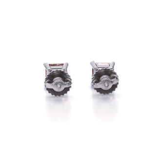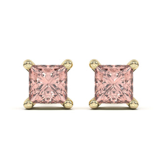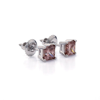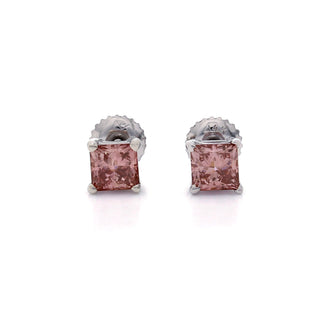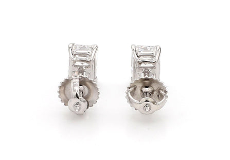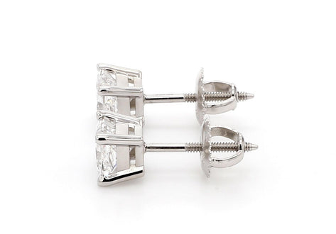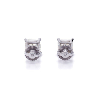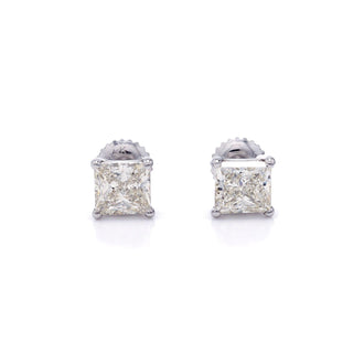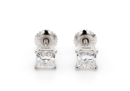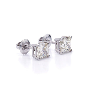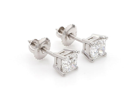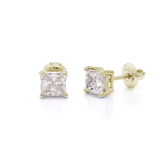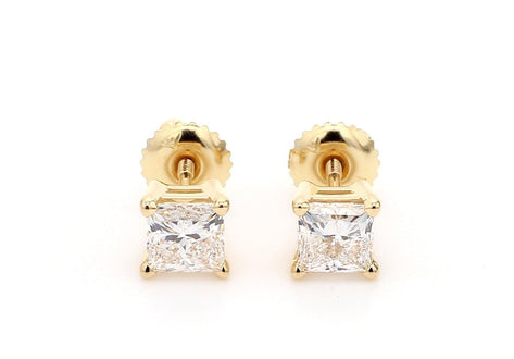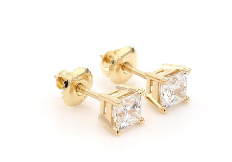 The radiant yet modern look of princess diamonds has made them the second-most popular diamond shape. This pair of modern, princess-cut diamond stud earrings feature a square top, four beveled sides, and a point resembling an upside-down pyramid. They come in great value and amazing quality mounted in 18K white gold and yellow gold screw-back posts.