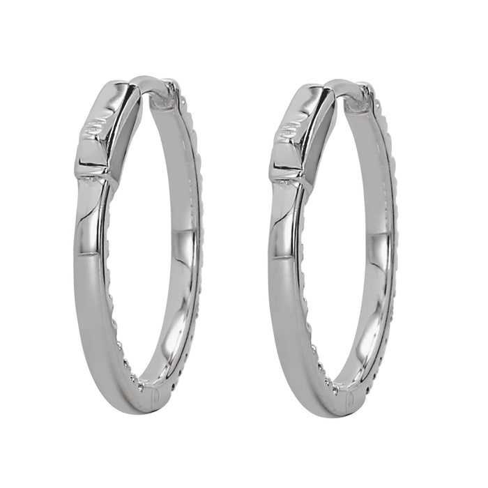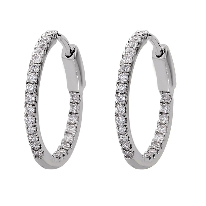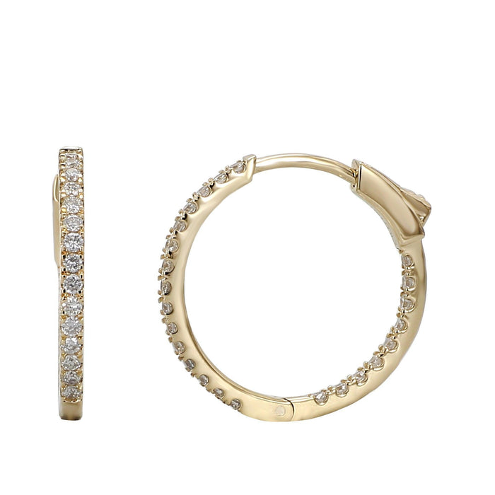 Simple and classic, 1/2 carat total weight lab grown diamond hoops are charming. Brilliant round cut lab grown diamonds have a F-G color and VS-SI clarity, prong set inside out style. These 14K gold small huggie hoops are extremely versatile and fit into any wardrobe and complement any occasion. The Sku number is 453741