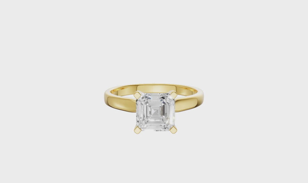 An exquisite choice that showcases a sparkling 4.0 carat asscher lab grown diamond solitaire in a timeless four prong solid setting merged into a polished platinum, white or yellow gold band. The color is F with a clarity of VS ranking. This ring is a simple yet versatile choice and one you can build upon. Traditional wedding bands on either side or other style, even custom-made accompanying rings for a personal touch.