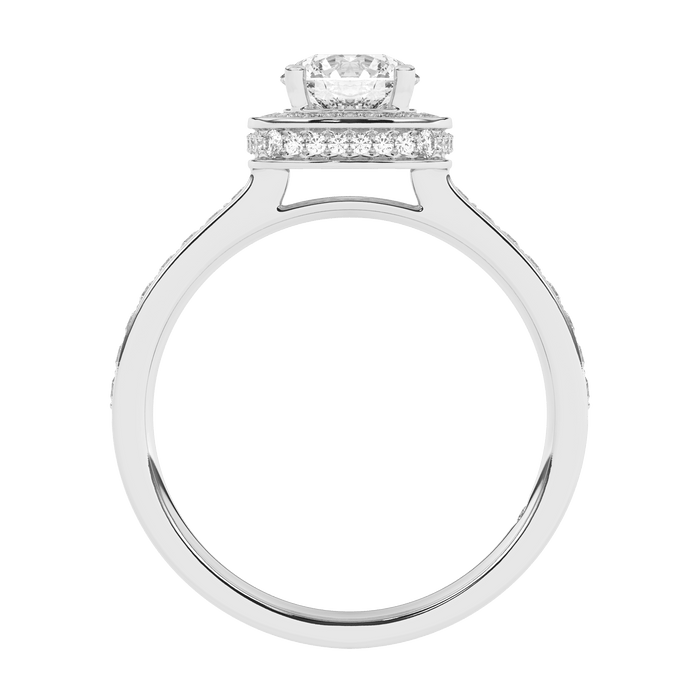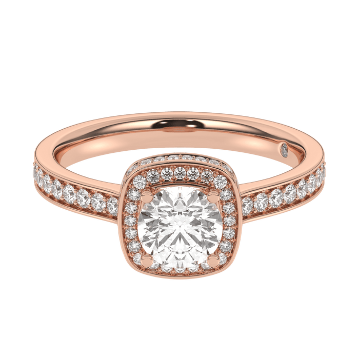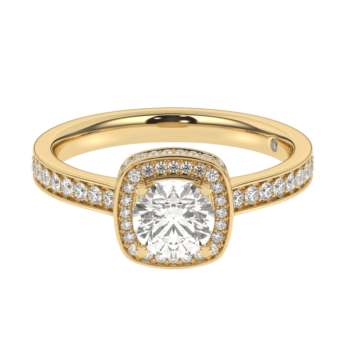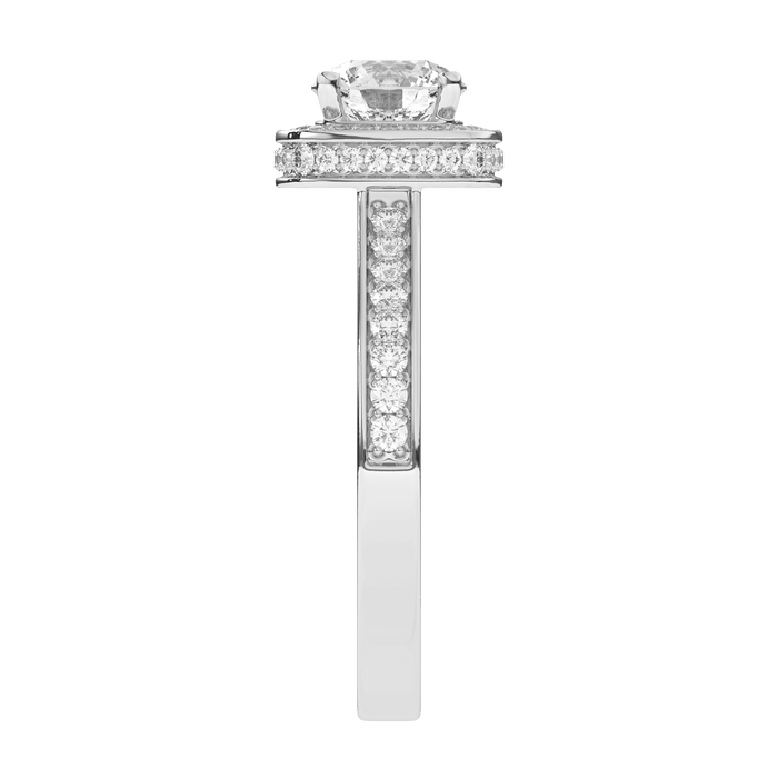 Fashioned in precious gold or fine platinum, this fashionable design highlights the center lab grown diamond of your choice, set into in a lovely accented square halo frame top and hidden and lab grown diamond accents line the ring's slender tapered shank totaling 1/3 carat weight, creating a look beyond all compare. This engagement ring is destined to delight and is the perfect style for coordinating with different band rings for a creative look.