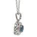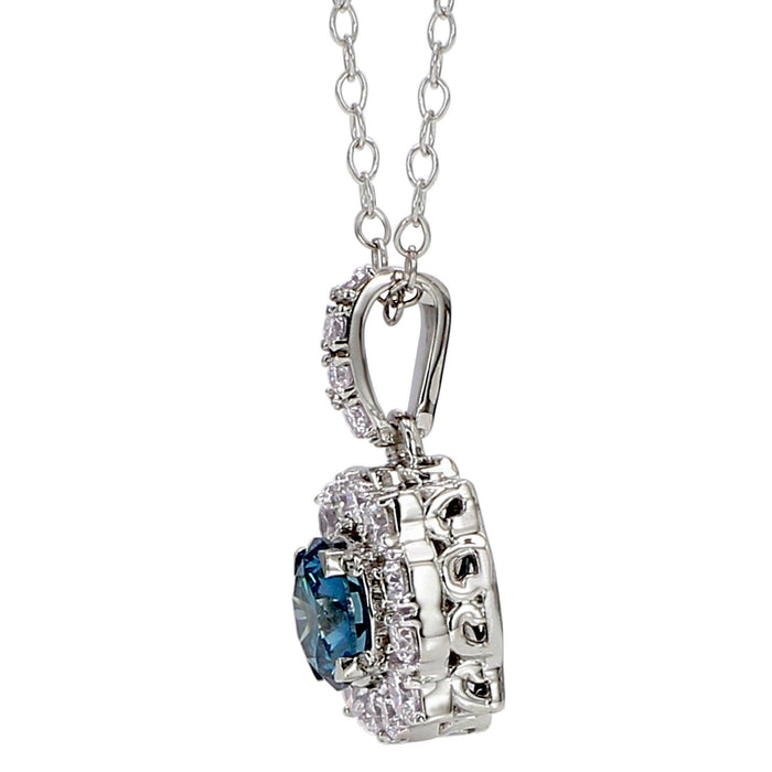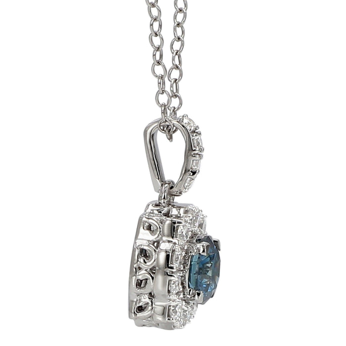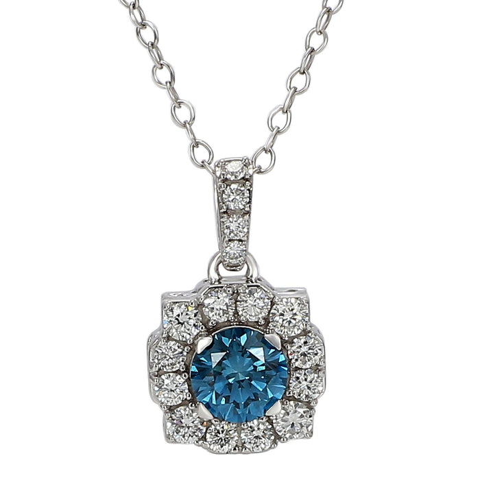 Something blue for your jewelry collection. The blue and white lab grown diamond pendant is crafted in 14K gold. This eye catching pendant features a blue lab diamond wrapped in a halo frame of shimmering F-G, VS-SI white lab diamonds. Dangling from a 16-inch chain with a two-inch extension the 1.0 carat halo pendant will be a treasured piece in your jewelry collection.