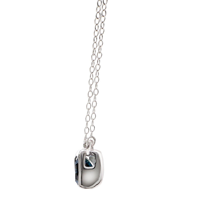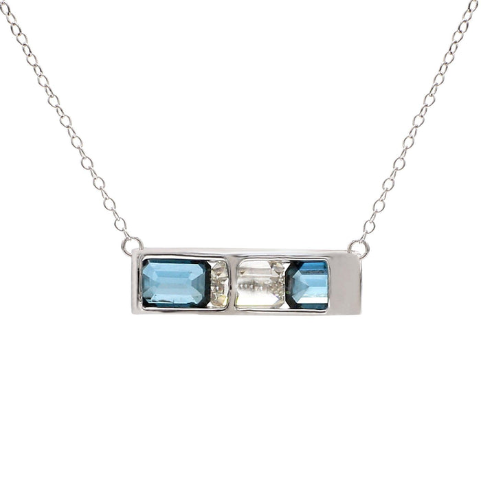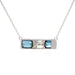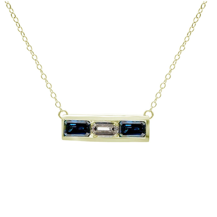 Fashionable sweet bezel look in a 1/2 carat total weight lab grown diamond necklace. Fashioned in precious 14K gold, this lovely design features an 2 blue lab diamonds, one on each side of the white diamond. Captivating bar design and a brilliant, buffed luster, this pendant suspends along a 16 inch chain with a 2 inch extension that secures with a lobster clasp.