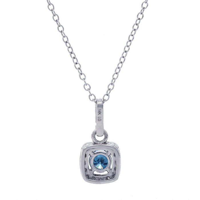 Ready for any occasion, this sweet blue and white lab grown diamond pendant is delightful. Crafted in 14K gold, this pretty pendant features a 1/3 carat blue color lab diamond wrapped in a square halo frame of shimmering F-G, VS-SI white lab diamonds totaling 1/6 carats. Radiant with 1/2 carat total weight of lab grown diamonds, a brilliant, buffed luster and dangling from a 16 inch chain with a two inch extension. The pendant is approximately 7.8mm wide by 14.9mm (including the bail) long.
