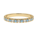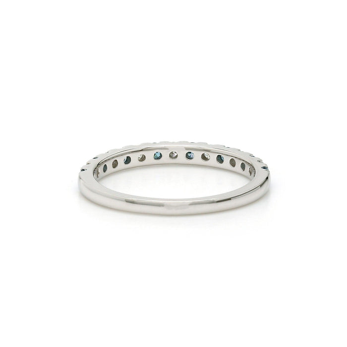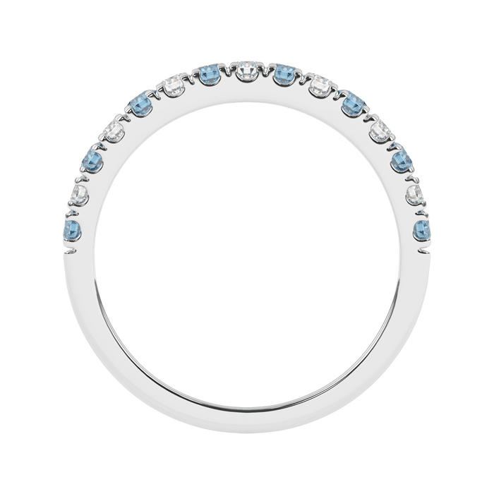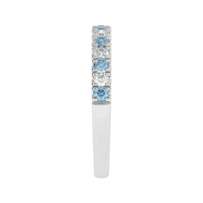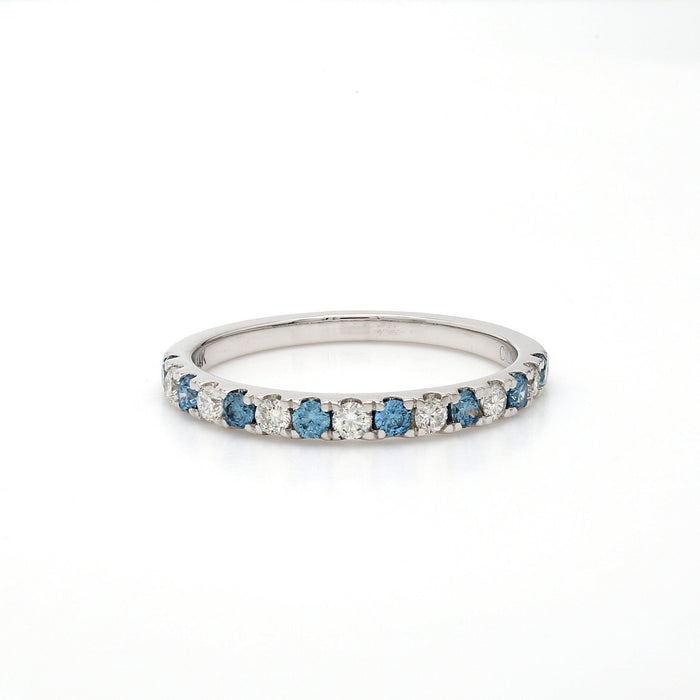 Simply sophisticated, this blue and white lab grown diamond band is a stack-able style to wear with anything. Fashioned in 14K gold, this slim design features blue lab diamonds alternating with shimmering white F-G, VS-SI lab diamonds. A lovely look, this ring is buffed to a brilliant, buffed luster.