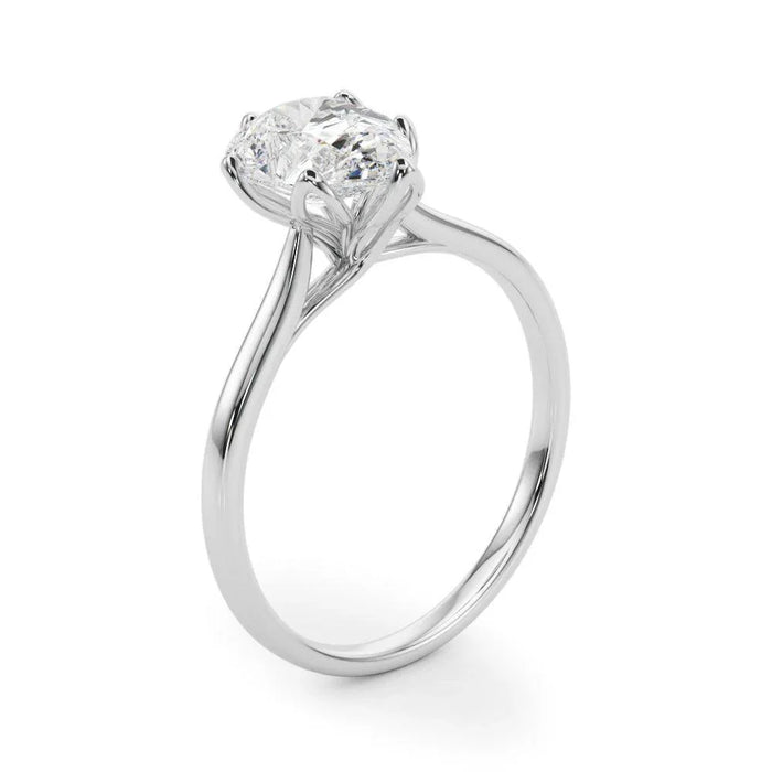 The Carly Solitaire pear shaped center lab grown diamond is a sparkling precious option for flower-lovers looking for an engagement ring. Its petal prong design offers subtlety and elegance, perfect for those who want to make a subtle statement.