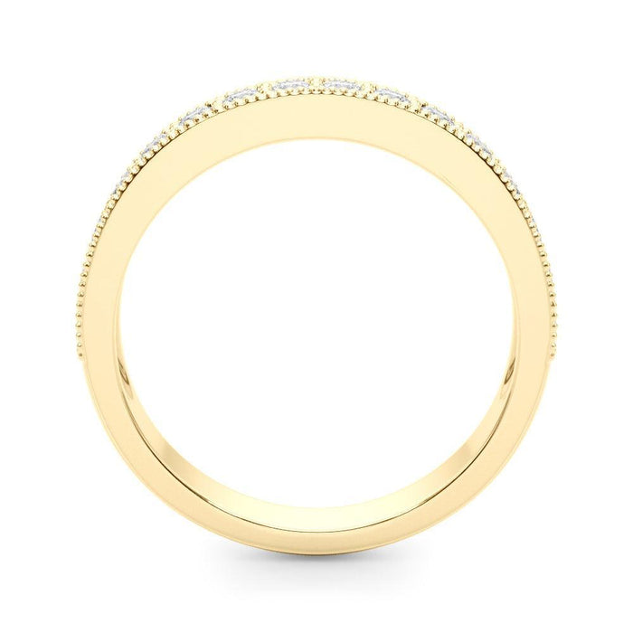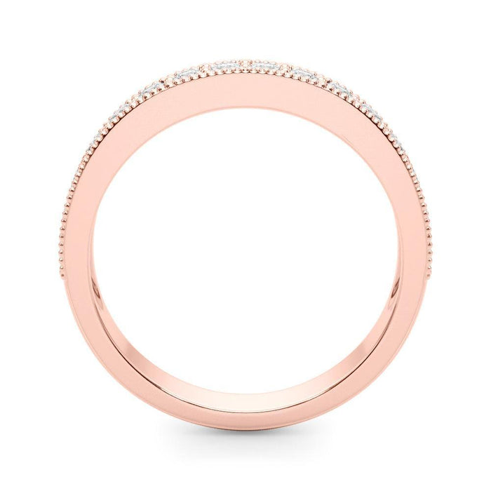 Debbie Wedding Band features 1/2Ctw. lab grown diamonds prong set in a channel styling with milgrain edging. Perfect for everyday wear, this band is also stackable or suitable as the matching wedding band for a straight style engagement ring.