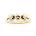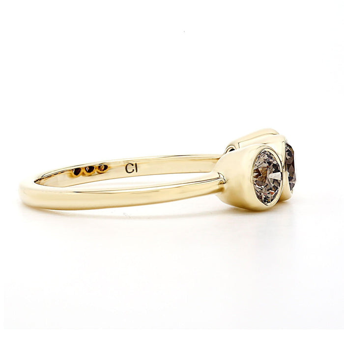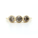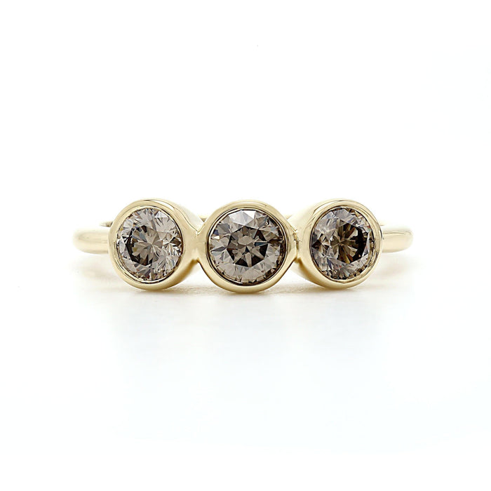 A contemporary choice for a beautiful three stone bezel ring. Sculpted in 14K yellow gold, this design features a trio of bezel set lab grown black diamonds. Buffed to a brilliant luster, this artful look is a dazzling anytime choice.