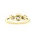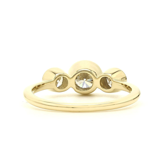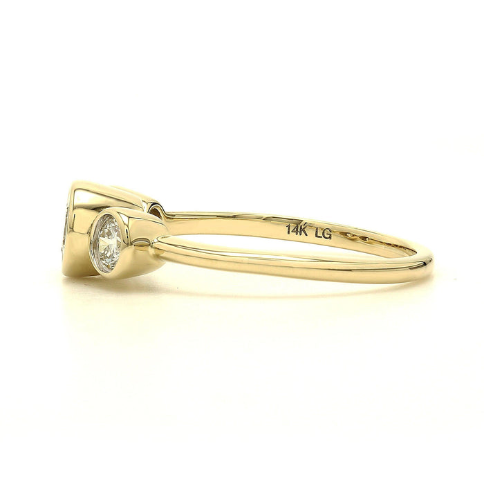 A contemporary choice for a beautiful three stone bezel ring. Sculpted in 14K yellow gold, this design features a trio of bezel set lab created diamonds that have a color ranking of I-J with VS-SI clarity create this artful look.