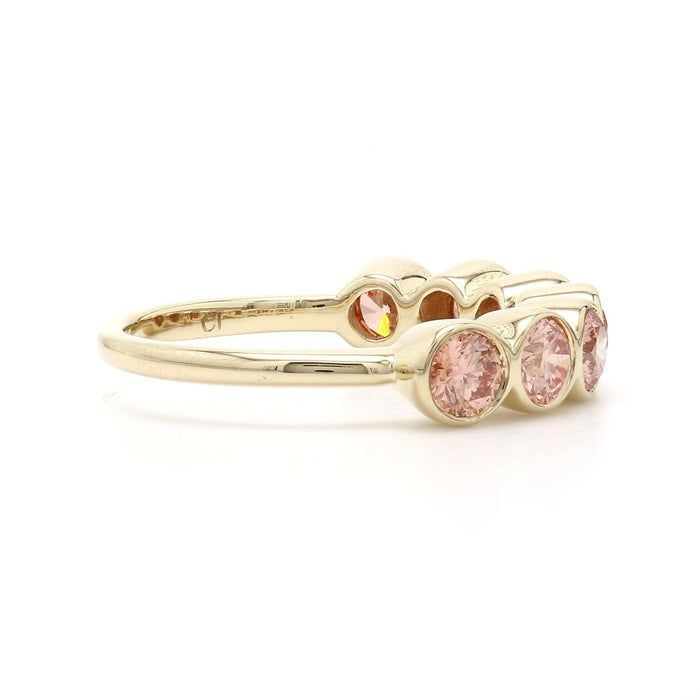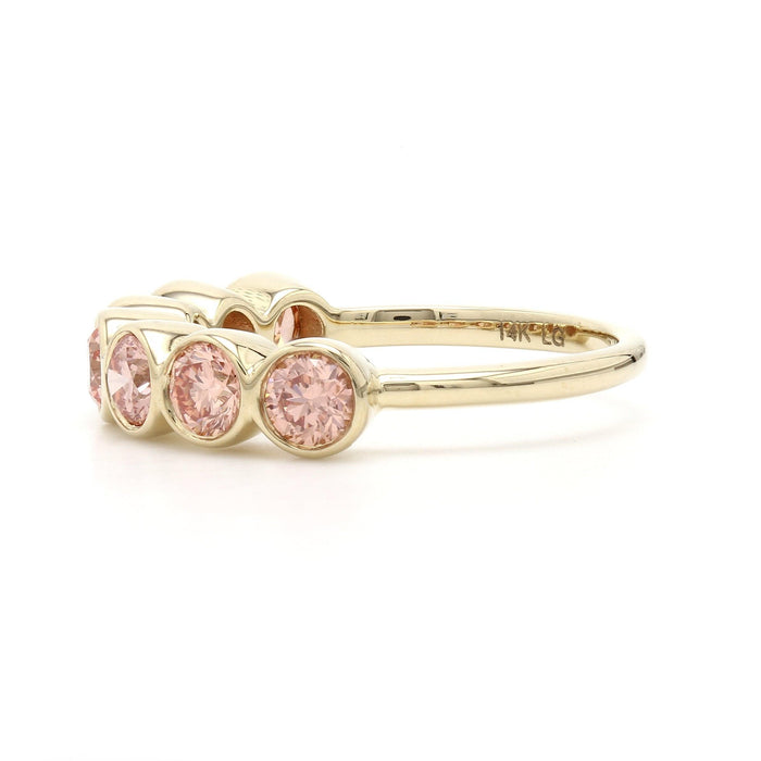 A simple and stylish ring that can be worn alone or stacked together to express your style, your family and your personality. Seven bezel set 1 1/2 carat total weight of lab-grown pink colored diamonds, sculpted in 14K yellow gold.