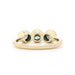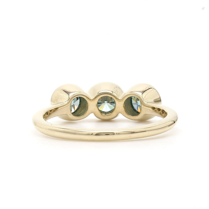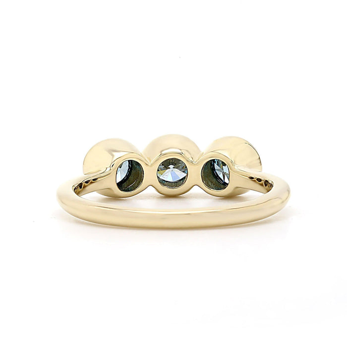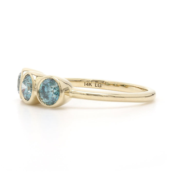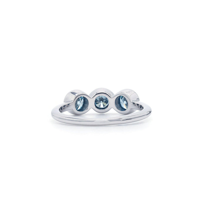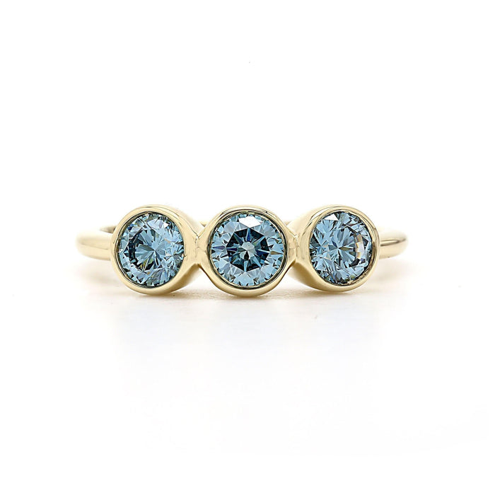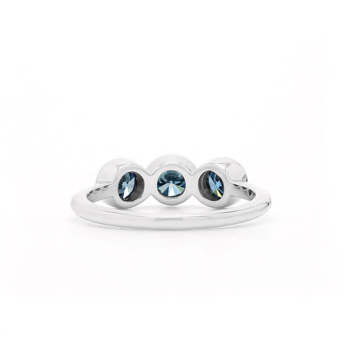 A contemporary choice for a beautiful three stone bezel ring. Sculpted in 14K white gold, this design features a trio of bezel set lab grown royal blue diamonds. Buffed to a brilliant luster, this artful look is a dazzling anytime choice.