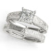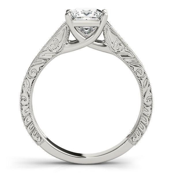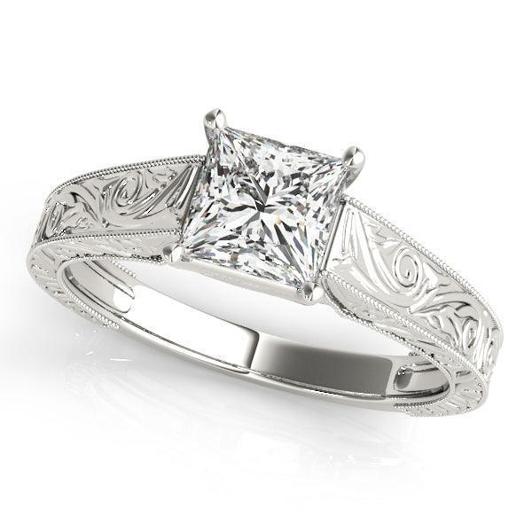 The Victoria Solitaire filigree bridal set is crafted with a distinct Victorian style, featuring intricate milgrain and etched work perfect the princess cut lab grown diamond 1 7/8 carat in E-F VS color/clarity. The matching band allows you to present a stunning wedding set. Perfect for those seeking a timeless look.