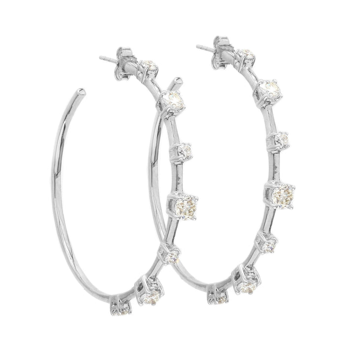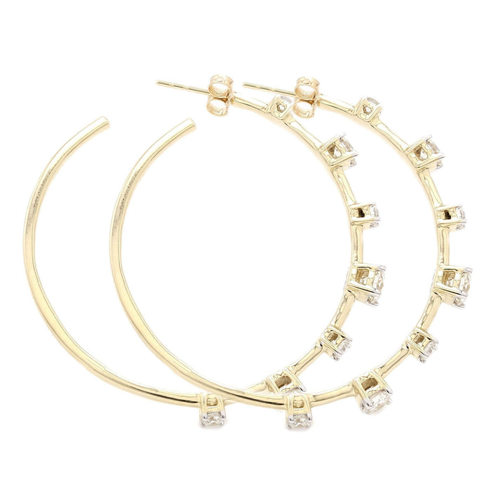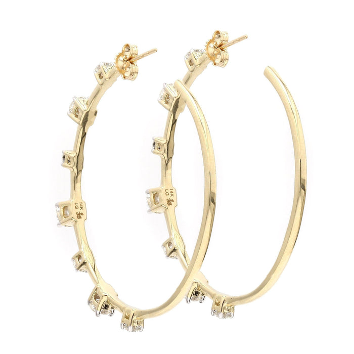 Turn heads with these alluring 2 1/2 carat total weight lab grown diamond hoop earrings. Crafted in 14K yellow or white gold, each prong set lab diamond have a I-J color and VS-SI clarity for a radiant brilliance that complements any outfit.