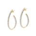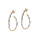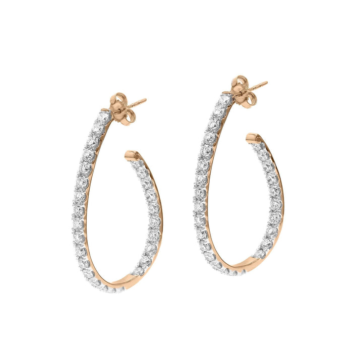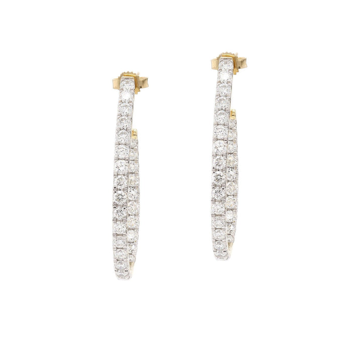 A bit of dazzle these 14K gold studded pear shaped J hoop earrings are perfectly charming. 3.00 carat total weight of white lab grown diamonds accent each earring along the front edge and along the inside of the back. The brilliant round cut lab grown diamonds have a F-G color and VS-SI clarity. These hoops have a bright polished shine and secure with butterfly backs.