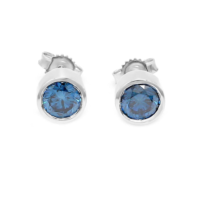 Classic and traditional, these bezels set stud earrings add an elegant touch to any attire. Fashioned in warm 14K gold, each earring holds a single blue colored lab grown diamond in a traditional bezel setting. Radiant with 1 1/4 carat total weight of lab grown diamonds and polished to a brilliant shine, these post earrings secure comfortably with friction backs.