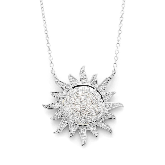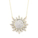 A sculpted sun artfully adorned with sparkling F-G VS-SI lab grown diamonds captures the rays of light. Radiant with a 3/4 carat total weight and made in 14k gold. This sparkling sunshine suspends along an 16 inch chain with 1 two-inch extension and secures with a lobster claw clasp.