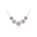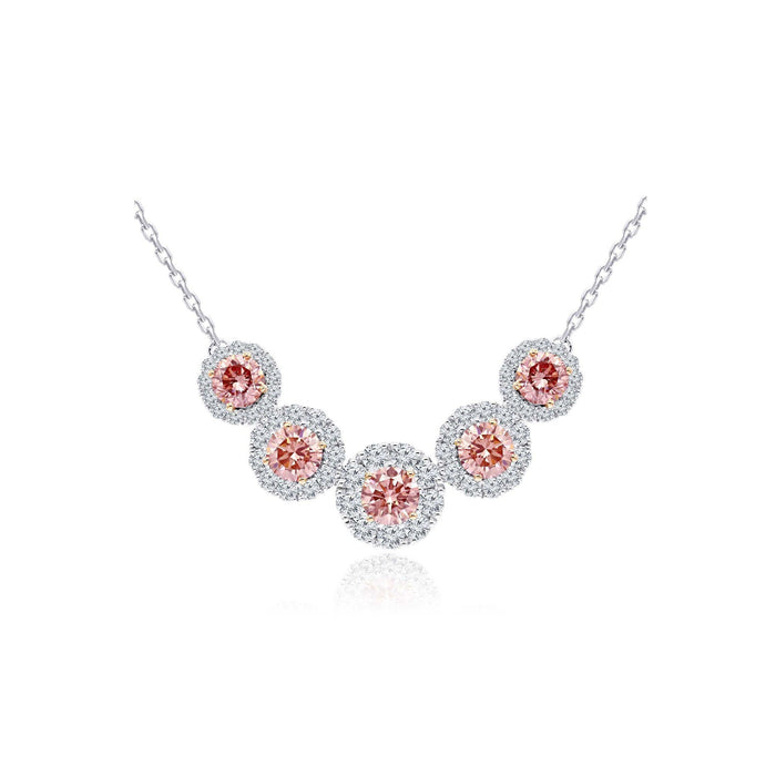 Regal and radiant, this pink and white lab grown diamond necklace is perfect for that special evening out. Crafted in cool 14K gold, five halo clusters of shimmering round lab grown diamonds, each focusing on the center pink colored lab diamond, graduating from smallest to largest to smallest and arranged in a clever chevron pattern, creating this eye-catching style. Designed to dazzle, this necklace captivates with a 4.35 carat total weight. Suspending the center along a 16.5 inch chain, where that last half of an inch is large loops for and adjustable fit, and secures with a lobster clasp.