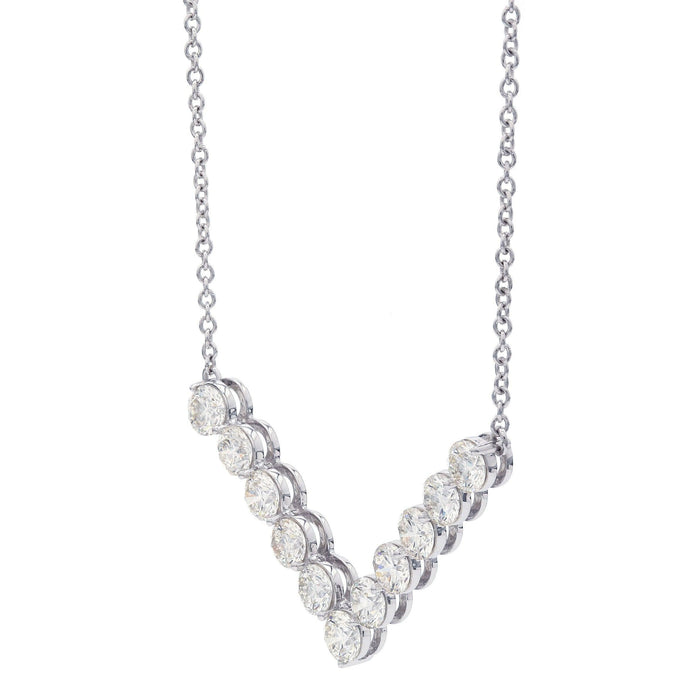 Delicately resting upon the neck, this masterpiece adorns her with a full 3 1/2 carats of luminescent shimmer. Set in cool and complementary 14K gold, a compelling style of lab grown round diamonds in a chevron design necklace. Totaling 3 1/2 carats of I-J, VS-SI lab diamonds for a style that's certain to inspire awe in those who behold it. The necklace is 16 inches with two 1 inch extensions and secured with a lobster clasp.