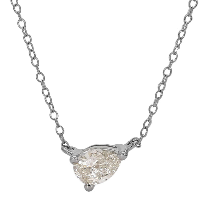 Simple enough to stand alone, the beauty of a lab grown diamond solitaire needs no accompaniment. This 3/4 carat pear shaped lab grown diamond necklace in 14K gold glistens with a color ranking of I-J and a clarity ranking of VS-SI. A stunning accessory that suspends along a 16-inch chain that has a two-inch extension. Giving it a little diversity for occasion worn and secures with a lobster clasp for ease of wear.