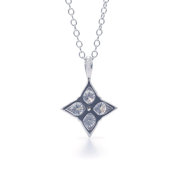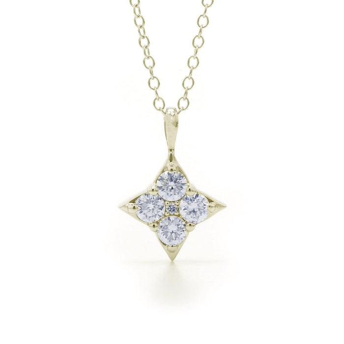 The four points pendant allures you with the remarkable round cut lab grown diamonds creating a beautiful traditional star pattern. 1/2 carat total weight of F-G color and VS-SI clarity, lab grown diamonds make up this petite design. Crafted in 14k gold and suspended on 16 inch chain with two 1 inch extensions make this the perfect accent to any outfit.