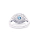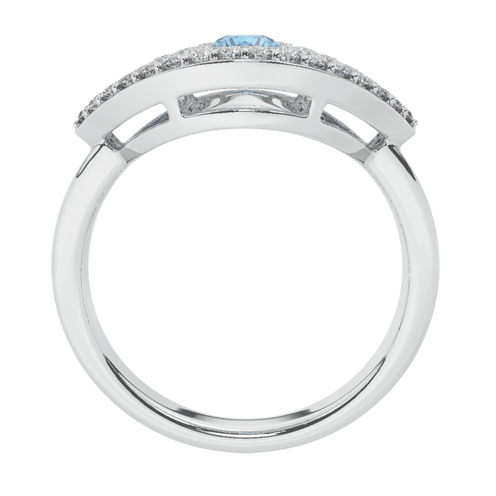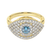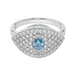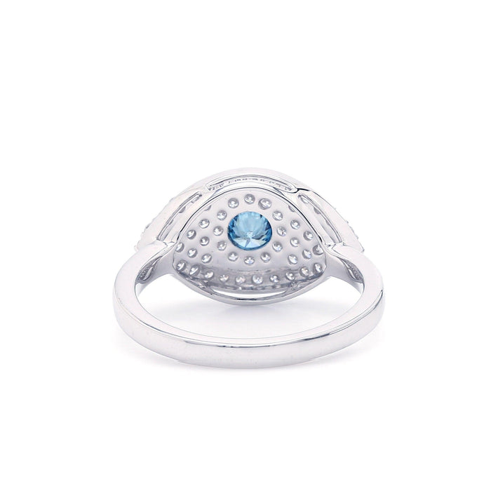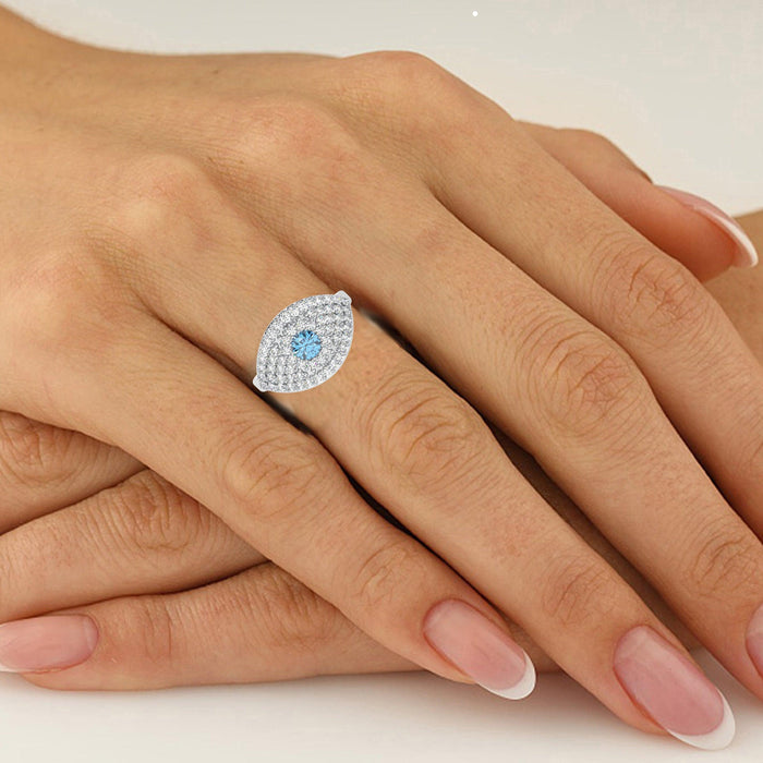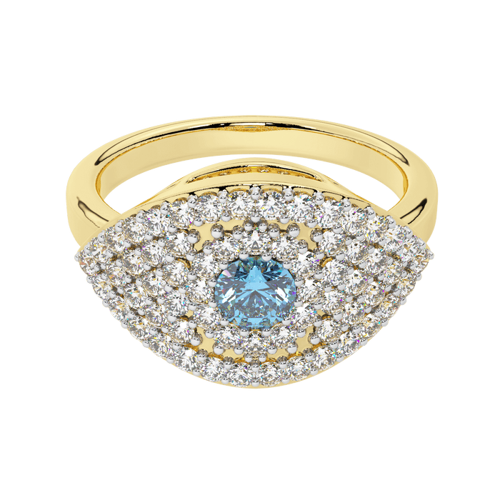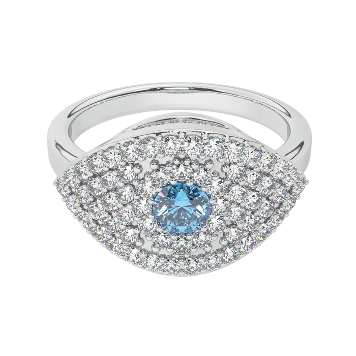 Step into history with this colorful royal blue and white lab grown diamond ring. Crafted in 14k gold and steeped in symbolism, the "evil eye" has held many different meanings throughout time. Traditions like "see no evil" an unblinking symbol of protection, representing the divine watchful gaze, all seeing gods of the sky, good luck charms and eye of conscience and many others. This beautiful evil eye ring shimmers with F-G color and VS-SI clarity, white lab diamonds around a royal blue color lab diamond center. Spectacular with 3/4 carat total weight of lab grown diamonds and a brilliant buffed luster.