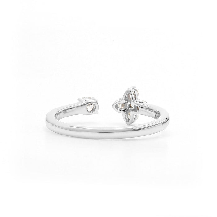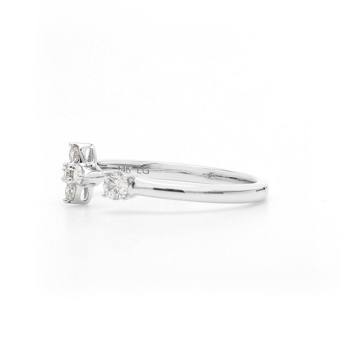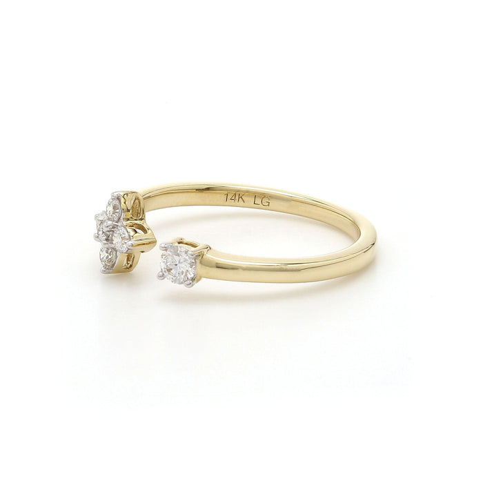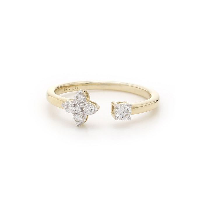 Sweet, sassy and on-trend fashion ring. The open end feature that has a single lab diamond on one side and punctuating the other side with a lab diamond flower design. Having 1/4 carat total weight of lab grown diamonds with a sparkling F-G coloring and VS-SI ranking and polished to a bright shine, this 14K gold ring delivers standout style. Custom made to fit her ring size.