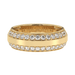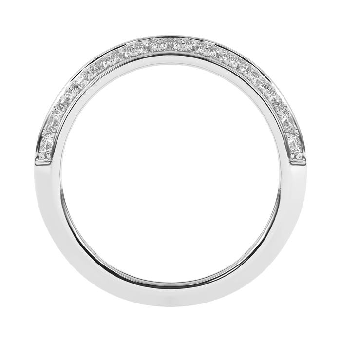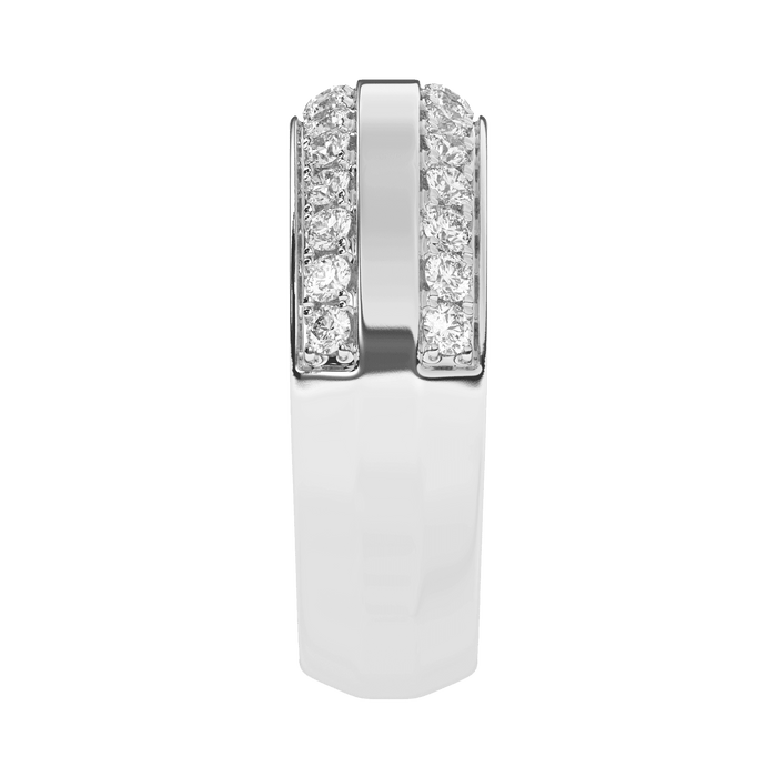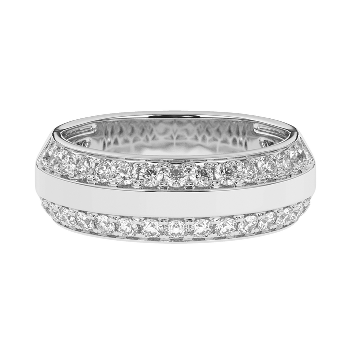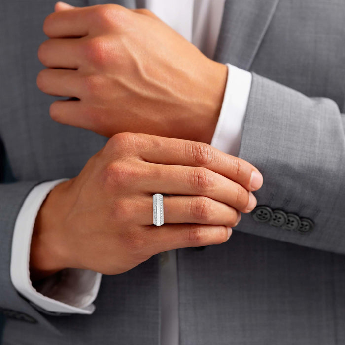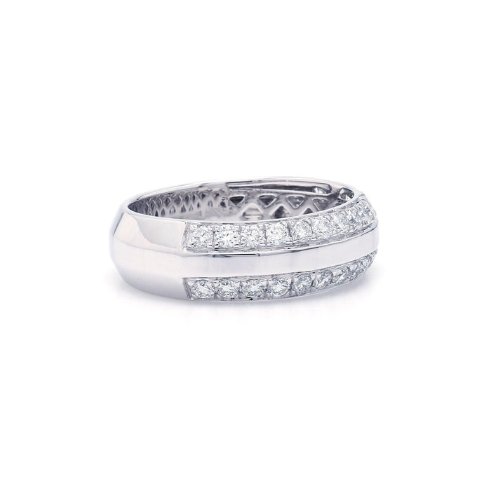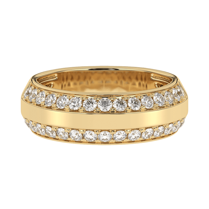 A brilliant dimensional men's lab grown diamond band. A dazzling look that features two rows of sparkling F-G, VS-SI lab grown diamonds totaling 1.00 carats with a high polished center strip dividing them. It's slender style and masculine appeal makes the band perfect for everyday wear. This stunning piece is fashioned in 14k gold for an amazing high polished look.