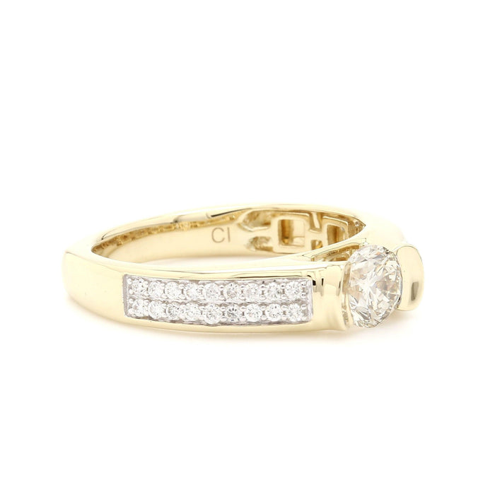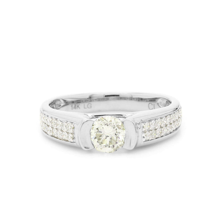 This classic looking man's solitaire style lab diamond ring has a simplistic design that is contemporary in nature. A remarkable 1.00 carat round brilliant cut lab grown diamond serves as the central focal point of this exhilarating piece. The two rows of side lab diamonds are F-G color and have a clarity of VS-SI. The center lab diamond is in a semi-bezel type setting, and the shank has a stunning dome like appeal.