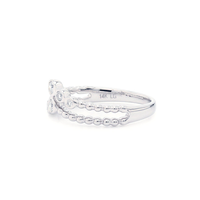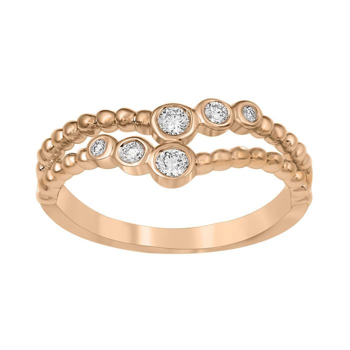 Dainty is trendy with this lab grown diamond band. A dazzling look that features a chevron style double row of sparkling F-G, VS-SI lab grown diamonds totaling 0.15 carats. It's slender style can stack nicely with another ring. The bezel set lab diamonds makes this a perfect everyday style and 14K white, yellow or rose gold to match your wardrobe.
