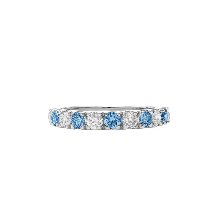 Simply sophisticated, this blue and white lab grown diamond band is a stack-able style to wear with anything. Fashioned in 14K white gold, this slim design features blue lab diamonds alternating with shimmering white F-G, VS-SI lab diamonds. A lovely look, this ring is buffed to a brilliant luster.