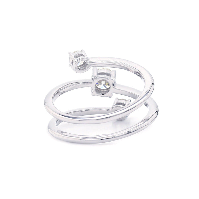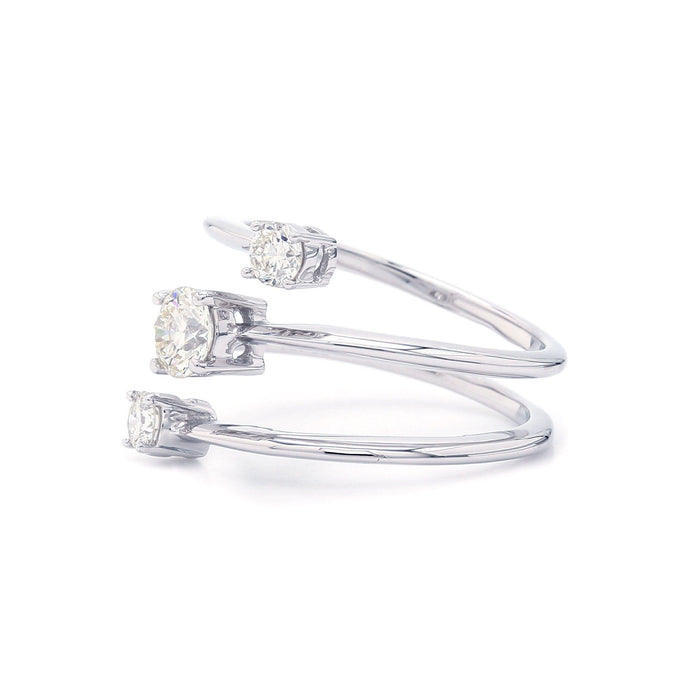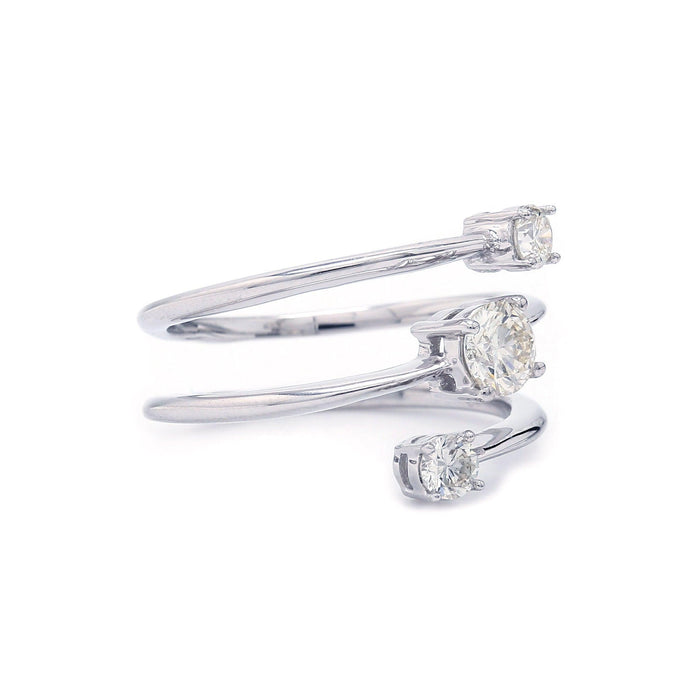 Modern and alluring, this lab grown diamond ring is a memory in the making. A dazzling three stone look that features a sparkling I-J color and VS-SI clarity lab grown diamonds totaling 3/4 carat. The sculpted swirl shank artfully bypass's the center stone and ends each with a diamond tip for a mesmerizing design in 14k gold.