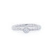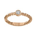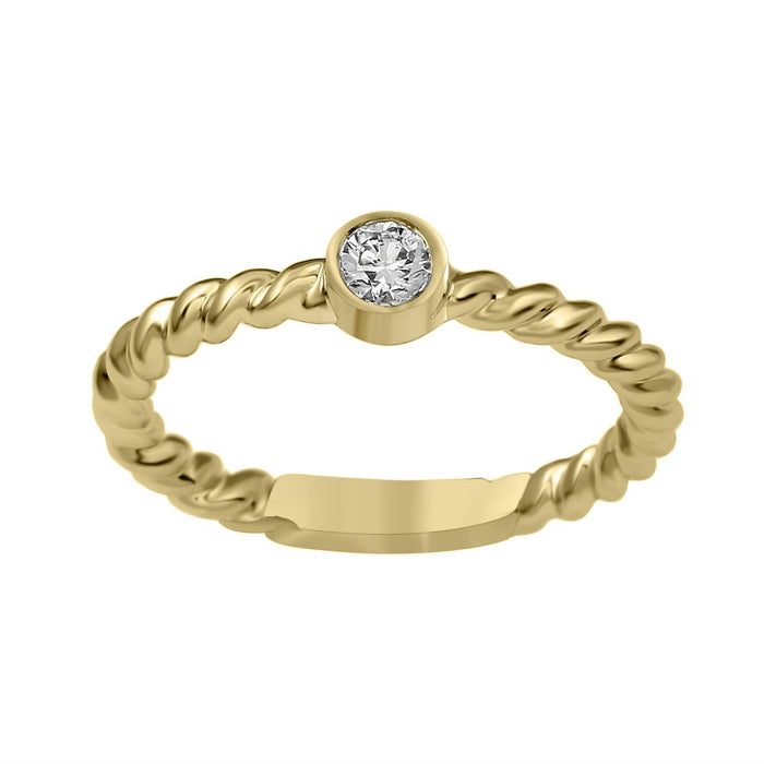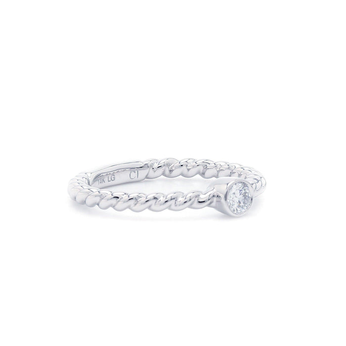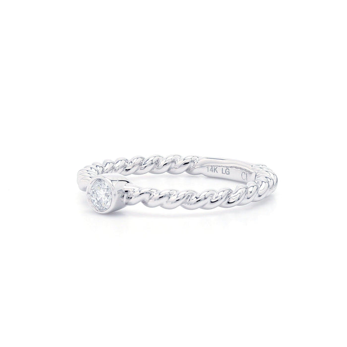 This sweet promise ring is a look of beauty. Gracefully swirling around the lab grown diamond center, this playful design sparkles with a bezel-set F-G, VS-SI 1/7 carat solitaire stone. A delightful look is certain to be treasured and with it's rope swirl and stack-able design; it's perfect for a "just because" band.