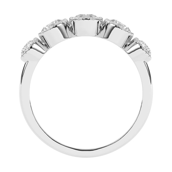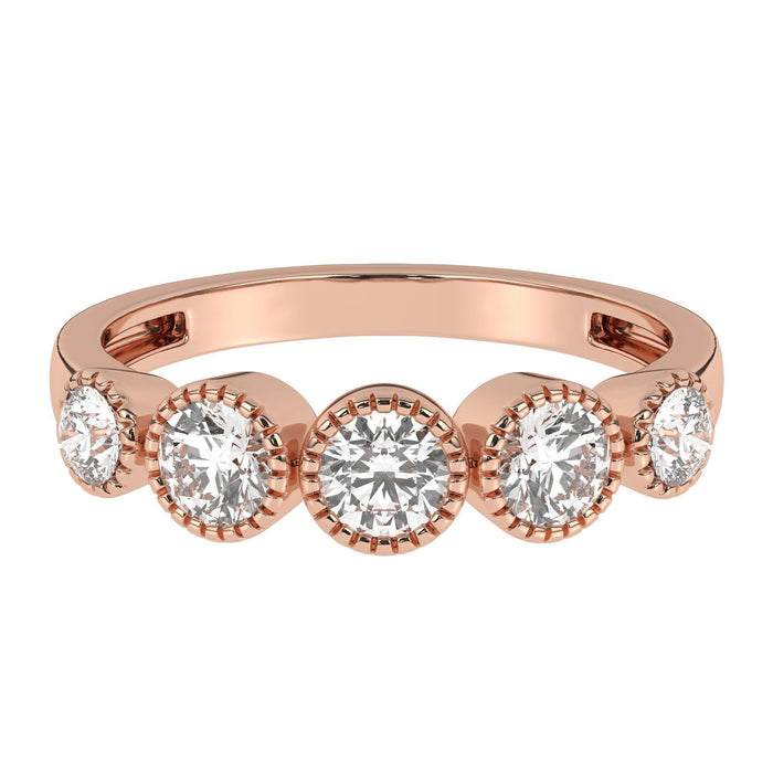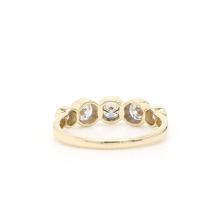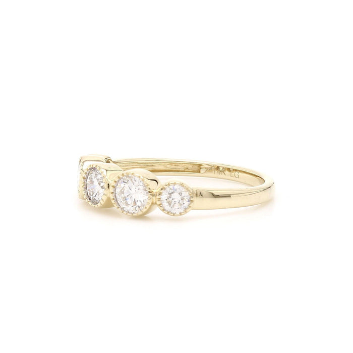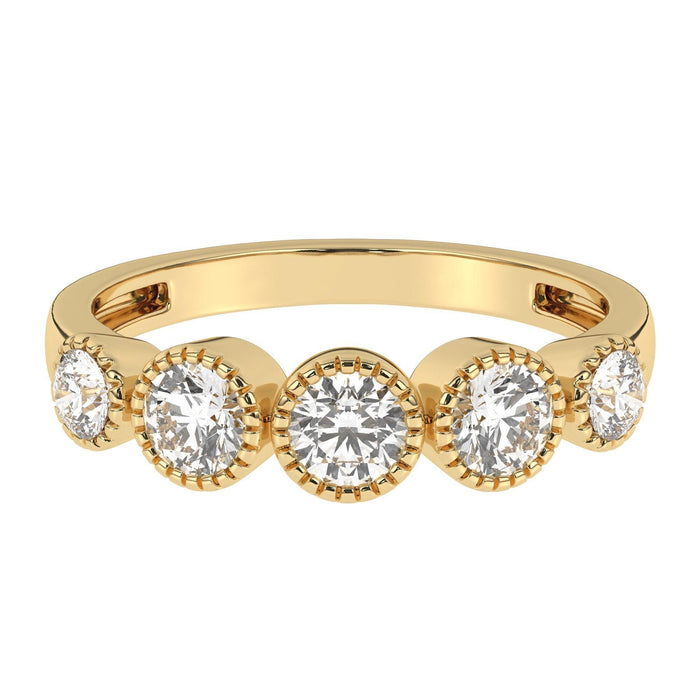 A vintage choice for a beautiful five stone bezel ring. Sculpted in 14K gold, this design features five bezel set lab grown white I-J / VS-SI diamonds. Buffed to a brilliant luster and a low profile mounting, this artful look is a dazzling anytime choice.