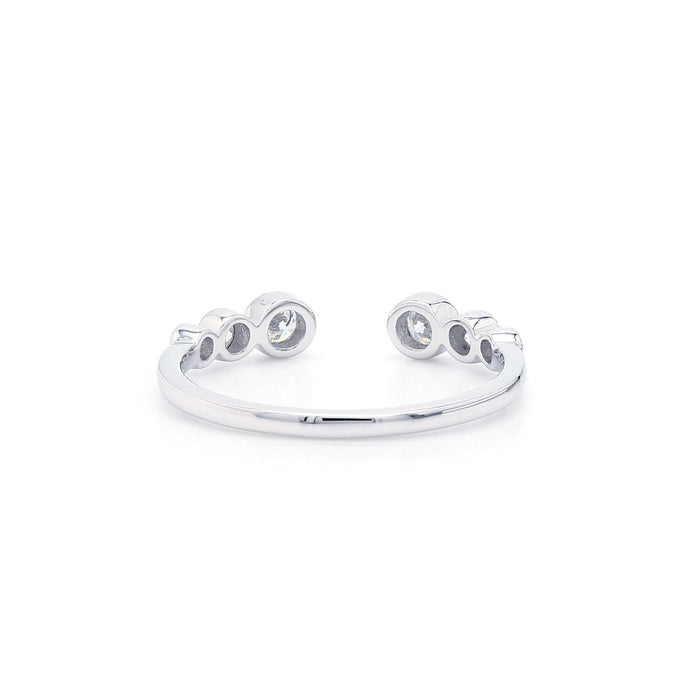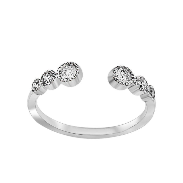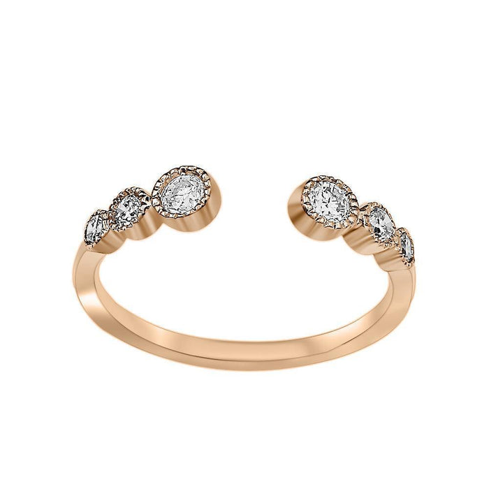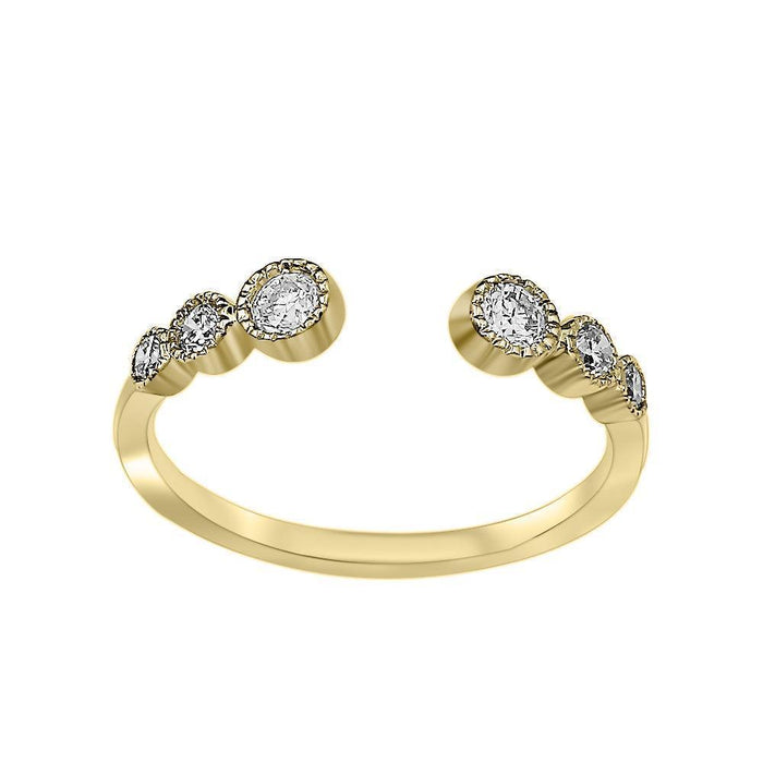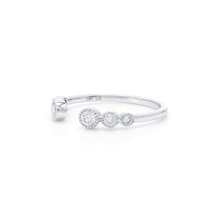 Sweet, sassy and on-trend fashion ring. The open end feature that has three graduating lab diamonds on each side, all bezel set in a milgrain frame. Having 1/3 carat total weight of lab grown diamonds with a sparkling F-G coloring and VS-SI ranking and polished to a bright shine, this 14K white, yellow or rose gold ring delivers standout style.