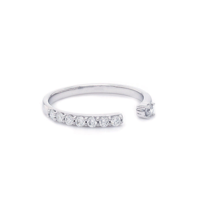 Sweet and on-trend open end fashion ring. The open end feature has a row of lab diamonds on one side and a single diamond on the other. Having 1/3 carat total weight of lab grown diamonds with a sparkling F-G coloring and VS-SI ranking and polished to a bright shine, this 14K gold ring delivers standout style.