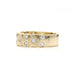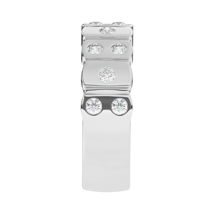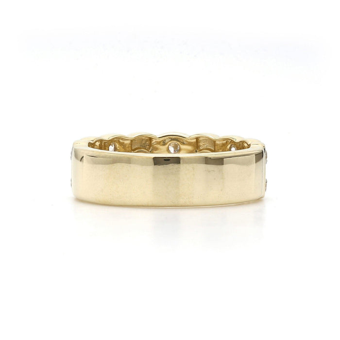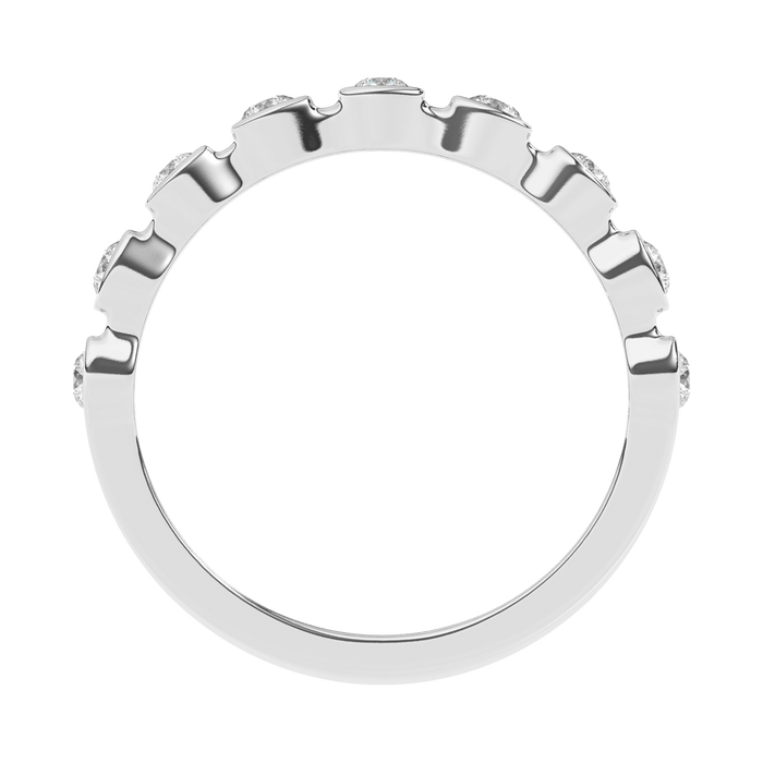 Perfect for every day wear, this fashion band adds to any attire. Crafted in fine 14K gold, this stylish ring features a clever alternating design set with shimmering round lab grown diamonds. A look that features 14 round diamonds averaging 0.035 each for a 1/2 carat total weight of sparkling lab created diamonds with a color ranking of F-G with VS-SI clarity. This bezel style setting is 1.3mm in height* and 5.5mm in width* for a comfortable fit and feasible for a wedding band.