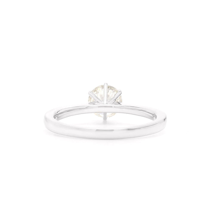 An exquisite choice that showcases a sparkling 0.93 carat round lab grown diamond solitaire in a timeless six prong solid setting merged into a polished 14K white gold shank. The diamond color is J with a clarity of VS2. A simple yet versatile choice and one you can build upon. Traditional wedding bands on either side or other stacking styles, even custom made accompanying rings for a personal touch. An IL certificate is available upon request.