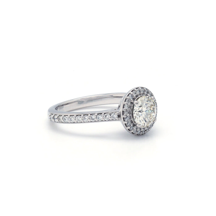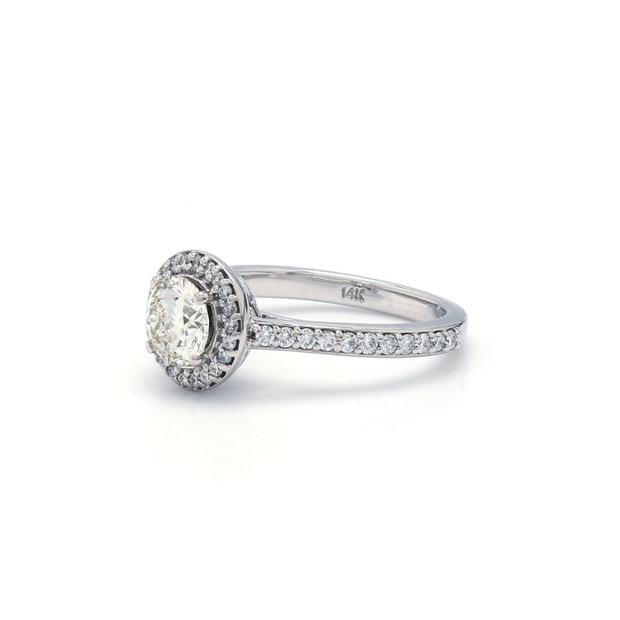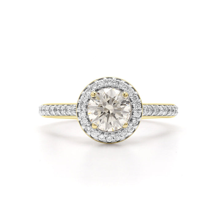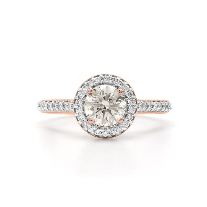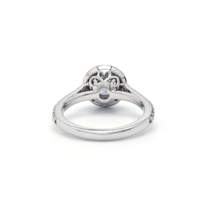 Fashioned in precious gold or platinum, this halo design highlights the lab grown diamond you choose. Holding the center is a filigree halo design adorned with F-G VS-SI lab grown diamond totaling 0.45 carats to complete this magical look. Spectacular vintage style, 0.45 carats of lab grown diamonds and a buffed luster, this engagement ring is fit for the occasion.