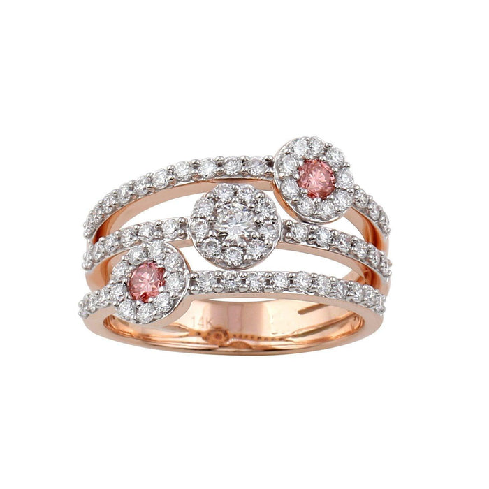 A brilliant halo triple bypass style. This 1.00 carat total weight band features three lines of lab diamonds with halo stations and slender prong set lab grown diamonds lining them, creating this bypass design. The lab grown diamonds have a sparkling F-G coloring and VS-SI ranking. This fashionable 14K rose gold ring is a great look any time.