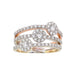 A brilliant halo triple bypass style. This 1.00 carat total weight band features three lines of lab diamonds with halo stations and slender prong set lab grown diamonds lining them, creating this bypass design. The lab grown diamonds have a sparkling F-G coloring and VS-SI ranking. This fashionable 14K tri colored gold ring is a great look any time.