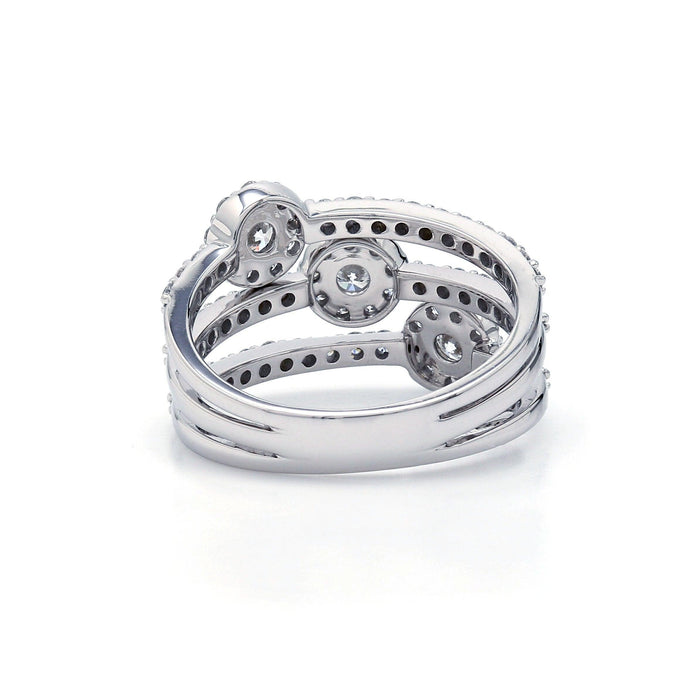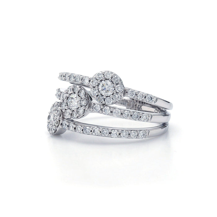 A brilliant halo triple bypass style. This 1.00 carat total weight band features three lines of lab diamonds with halo stations and slender prong set lab grown diamonds lining them, creating this bypass design. The lab grown diamonds have a sparkling F-G coloring and VS-SI ranking. This fashionable 14K gold ring is a great look any time.