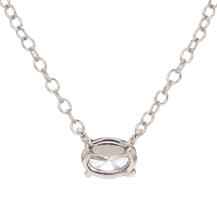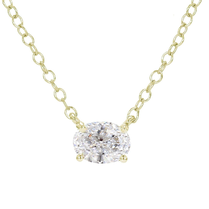 A petite 1/3 carat oval white lab grown diamond set east to west is held by 14K gold prongs in this trendy necklace for her. This 1/3 carat lab grown diamond sparkles with a color ranking of I-J and a clarity ranking of VS-SI. The pendant includes a 16 inch cable chain that has a two inch extension for a possible 18 inch fit which is secured by a lobster clasp for ease of wear.