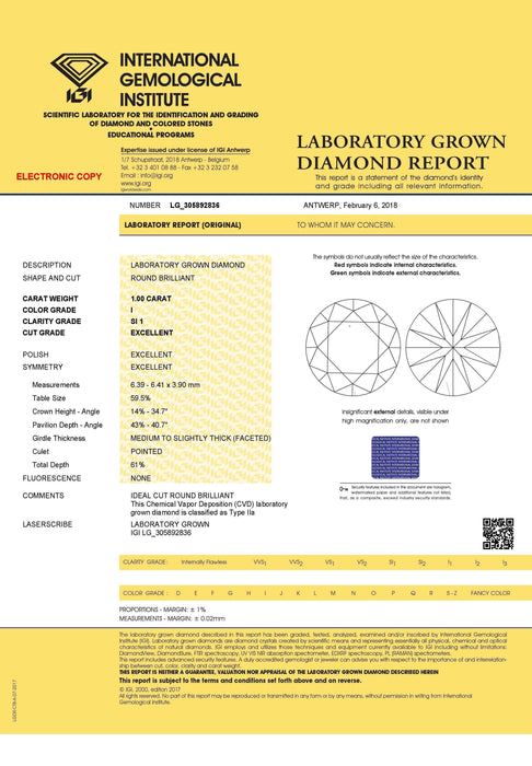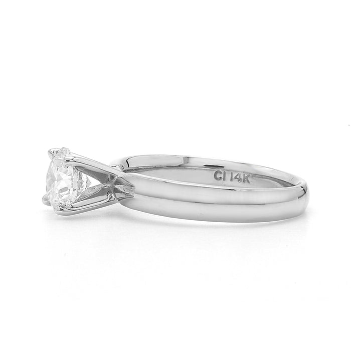 This classic solitaire features a traditional four prong mounting holding a 1.00 carat I SI1 in a 14K white gold high polished shank. The center lab grown diamond is a IL certified. The certificate number: 305892836