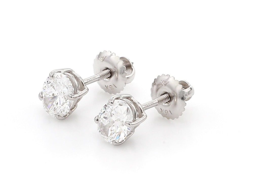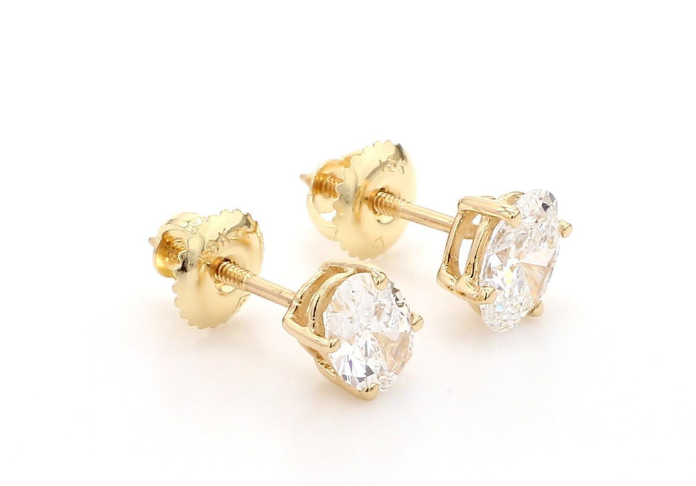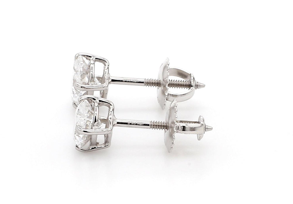 Classic oval lab grown diamond solitaire stud earrings, radiate. Perfect for everyday wear, the 1 1/2 carat total weight brilliant oval lab grown diamonds have a E-F color and VS1-VS2 clarity. The solitaires are set in a four-prong basket style 18K white or yellow gold setting with screw back closures. These beautiful earrings can stand alone or have an earring jacket to dress them up, extremely versatile and fit into any wardrobe and complement any occasion.