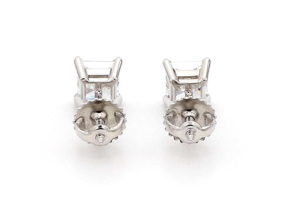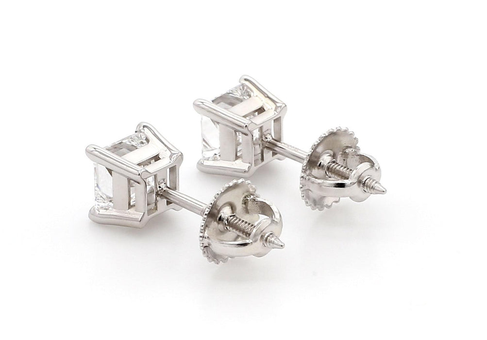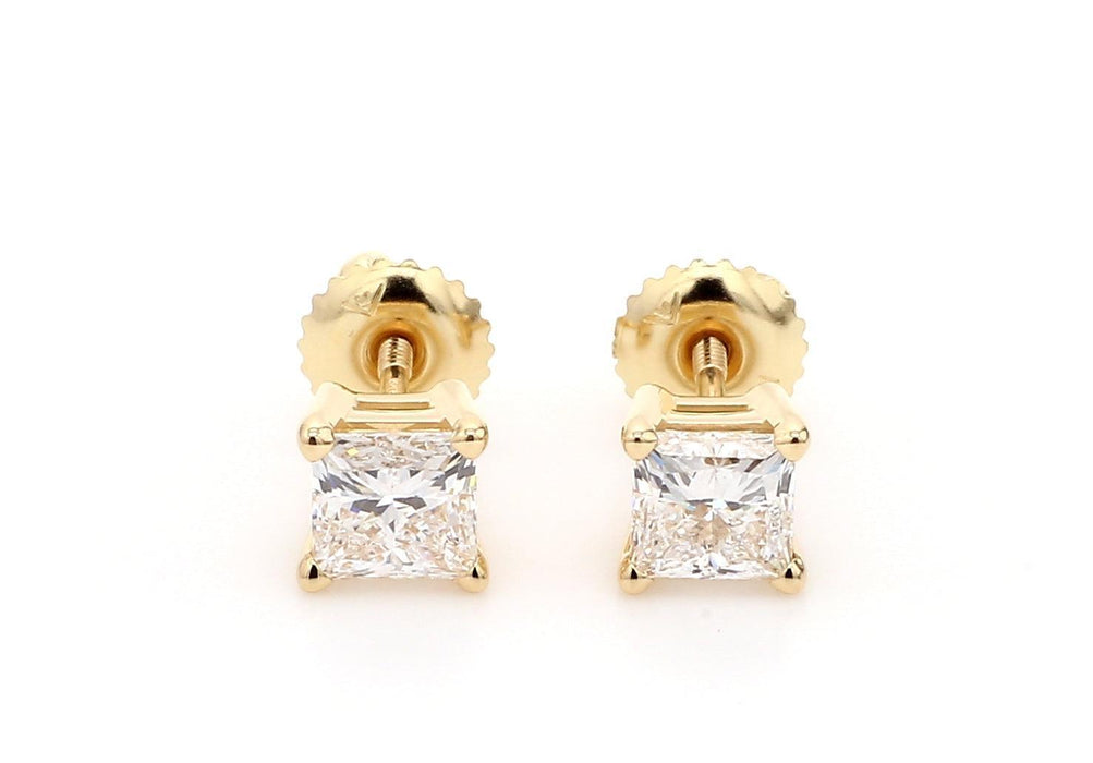 Princess cut lab grown diamond solitaire stud earrings. Perfect for everyday wear, the 1.0 carat total weight brilliant Princess lab grown princess diamonds have a E-F color and VS1-VS2 clarity. The solitaires are set in a four-prong basket style 18K white or yellow gold setting with screw back closures. These beautiful earrings can stand alone or have an earring jacket to dress them up, extremely versatile and fit into any wardrobe and complement any occasion.