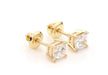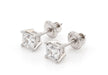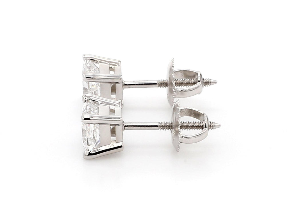 Timeless princess cut lab grown diamond solitaire stud earrings. Perfect for everyday wear, the 2.0 carat total weight brilliant lab grown princess diamonds have a E-F color and VS1-VS2 clarity. The solitaires are set in a 4-prong basket style 18K white or yellow gold setting with screw back closures. These beautiful earrings can stand alone or have an earring jacket to dress them up, extremely versatile and fit into any wardrobe and complement any occasion.