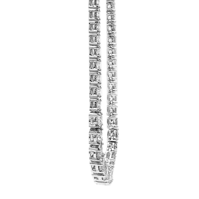 Simple, yet magnificent enough to stand alone, the beauty of a lab grown diamond tennis necklace needs no accompaniment. This one of a kind 22.00 carat total weight lab grown diamond necklace in 14K white or yellow gold glistens. Diamonds have a color ranking of I-J and a clarity of VS-SI. A stunning accessory with tapering stations of diamonds along it's 17 inch length. Gives it a little diversity for any occasion it's worn and secures with a tongue and groove clasp for ease of wear.